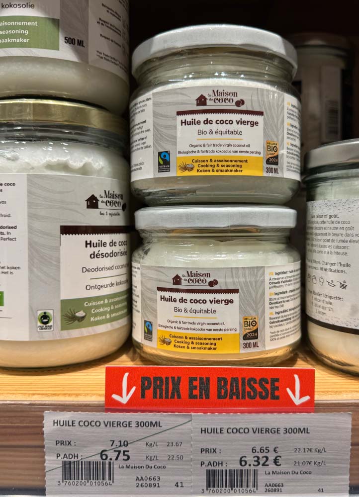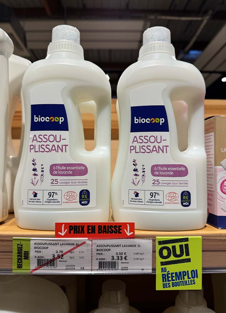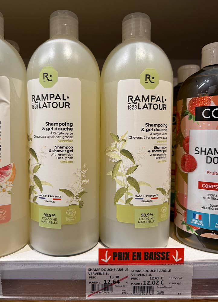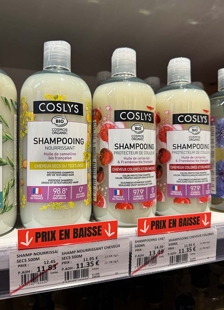 Enfin, au rayon des cosmétiques et des produits d’hygiène et d’entretien, le shampooing nourrissant Coslys baisse de 0,50€ et le shampooing protecteur de couleur de 2,25€, le shampooing et gel douche à l’argile verte Rampal-Latour de 1,35€, le savon de Marseille de 0,80€ et l’assouplissant Biocoop de 0,20€.