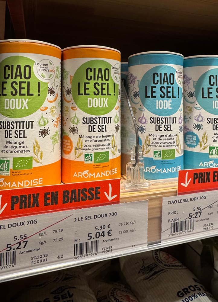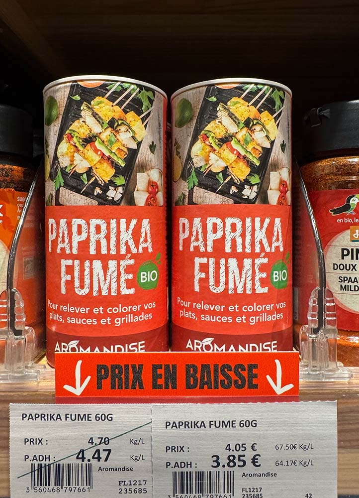 Du côté des épices, le paprika fumé Aromandise baisse de 0,65€ et les substituts de sel Ciao le sel ! aux légumes et aromates de 0,25€.