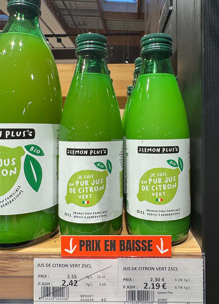 Le petit flacon de 25 cl de jus de citron vert Lemon Plus baisse de 0,25€ et le jus d’orange sans pulpe de 0,16€.