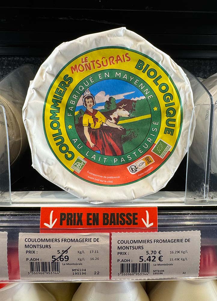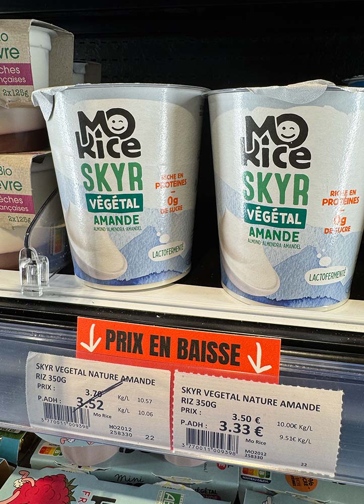 Le Montsûrais, Coulommiers bio fabriqué en Mayenne, baisse de 0,29€ et le skyr végétal à l’amande Mo’Rice de 0,20€.