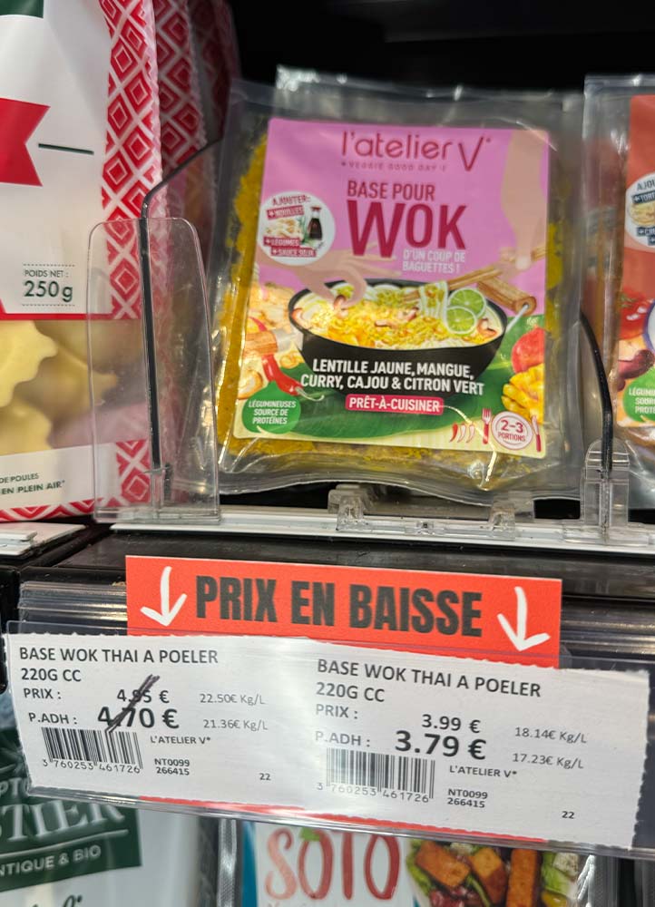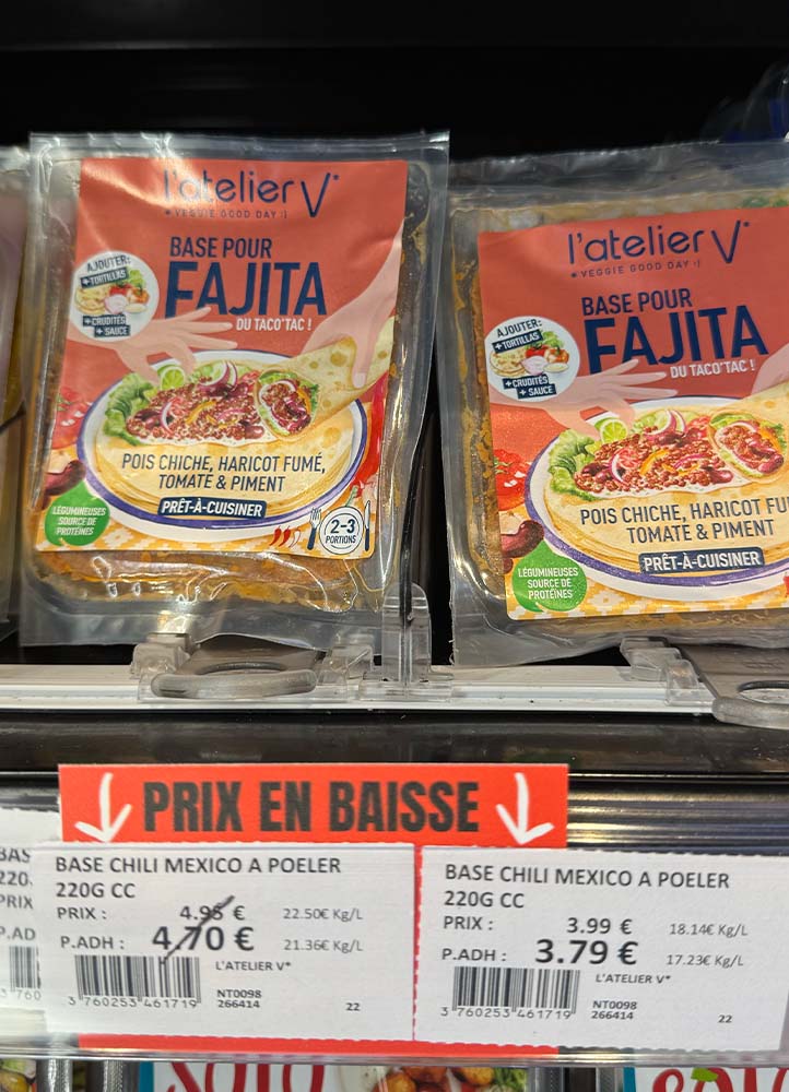 Au rayon frais, les préparations à poêler végétales de L’Atelier V à base de pois chiches, lentilles et épices baissent de 0,96€ : idéales avec des pâtes ou du riz, dans des bols complets, des wraps chauds avec de l’avocat…