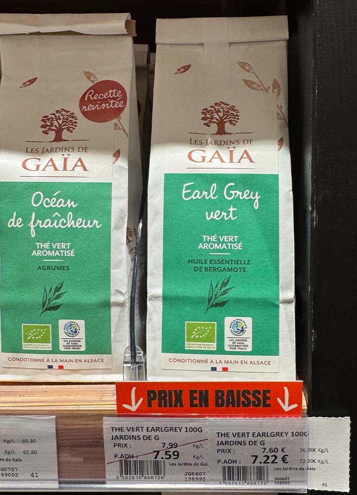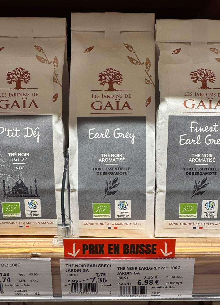Chez notre fournisseur Les Jardins de Gaïa, le thé vert Eart Grey vert baisse de 0,39€ et le thé noir Earl Grey de 0,40€.