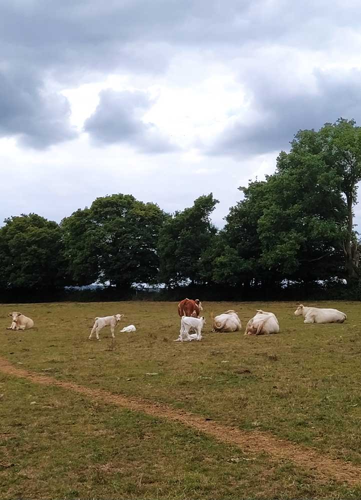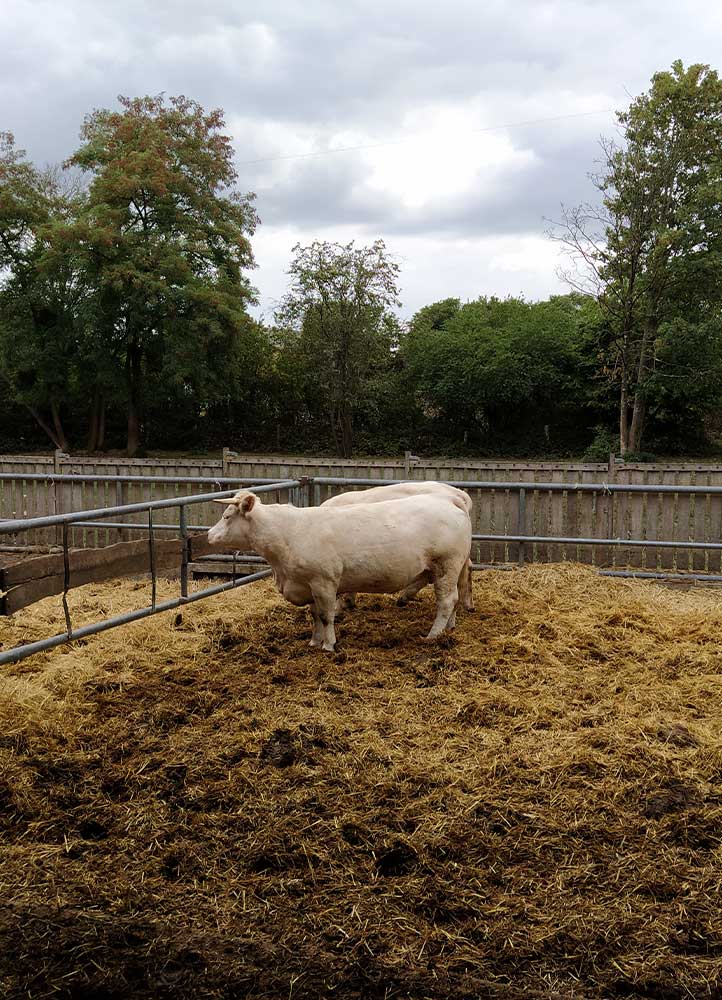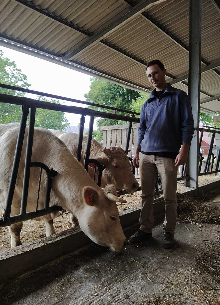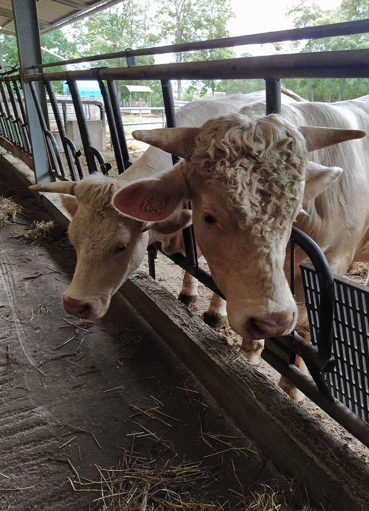 Le cheptel d’une centaine de bêtes charolaises est nourri de pâture, foin et méteil (féverole, avoine et seigle) intégralement cultivés à la ferme. « Dès qu’on a pu, on a adhéré au groupement UNEBIO pour assurer des débouchés solides à notre viande de bœuf bio. »