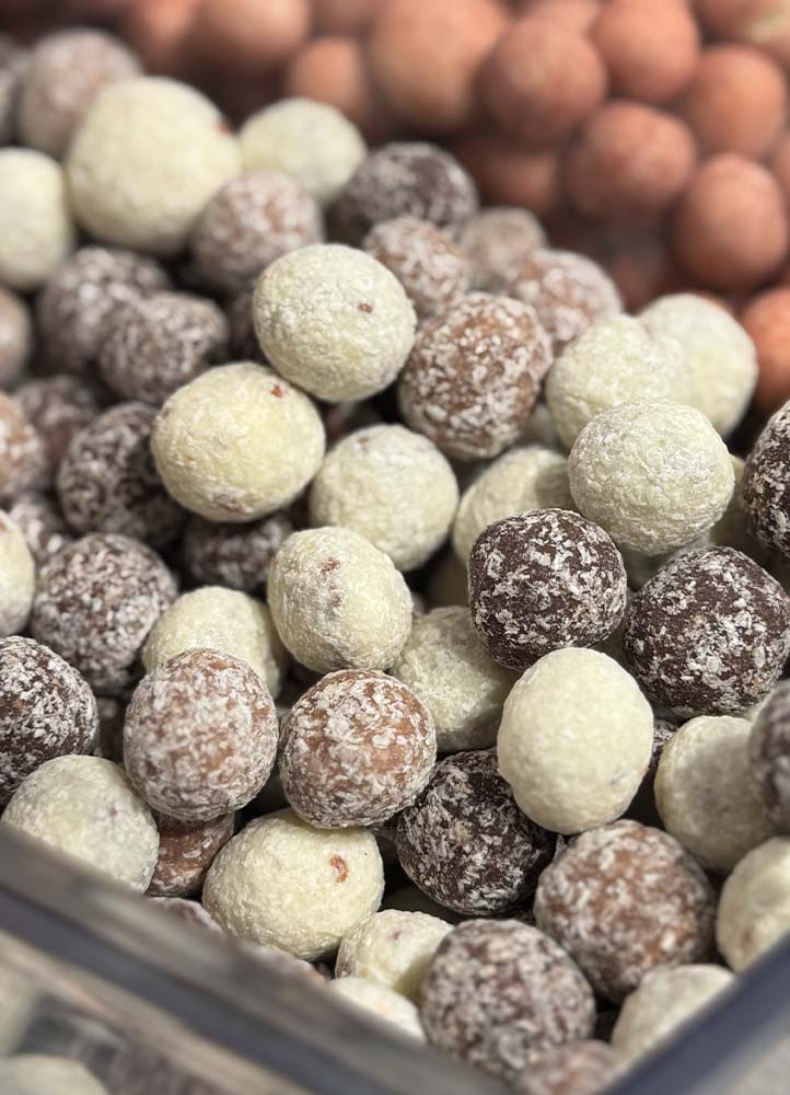 - Trio de noisettes au chocolat noir, au lait et blanc enrobées de noix de coco