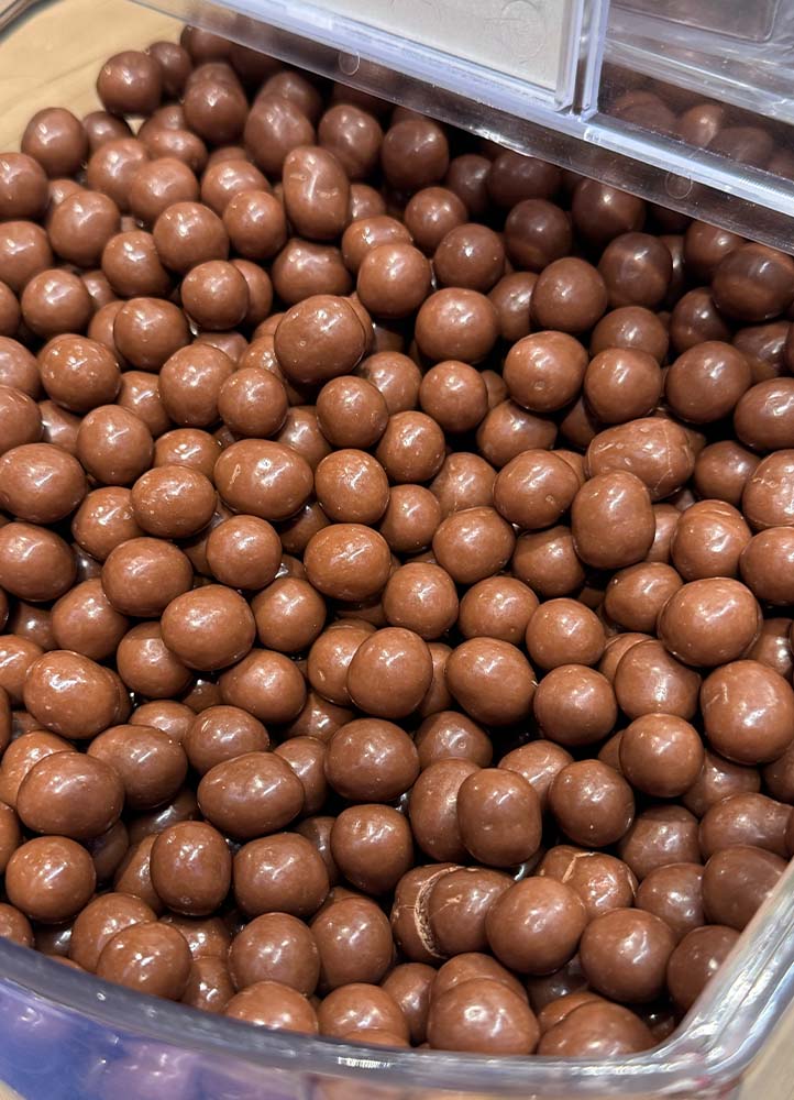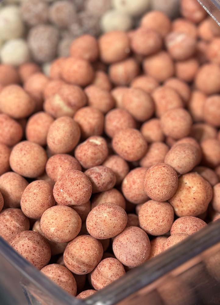 - Noisettes enrobées de chocolat au lait et saupoudrées de poudre de framboise