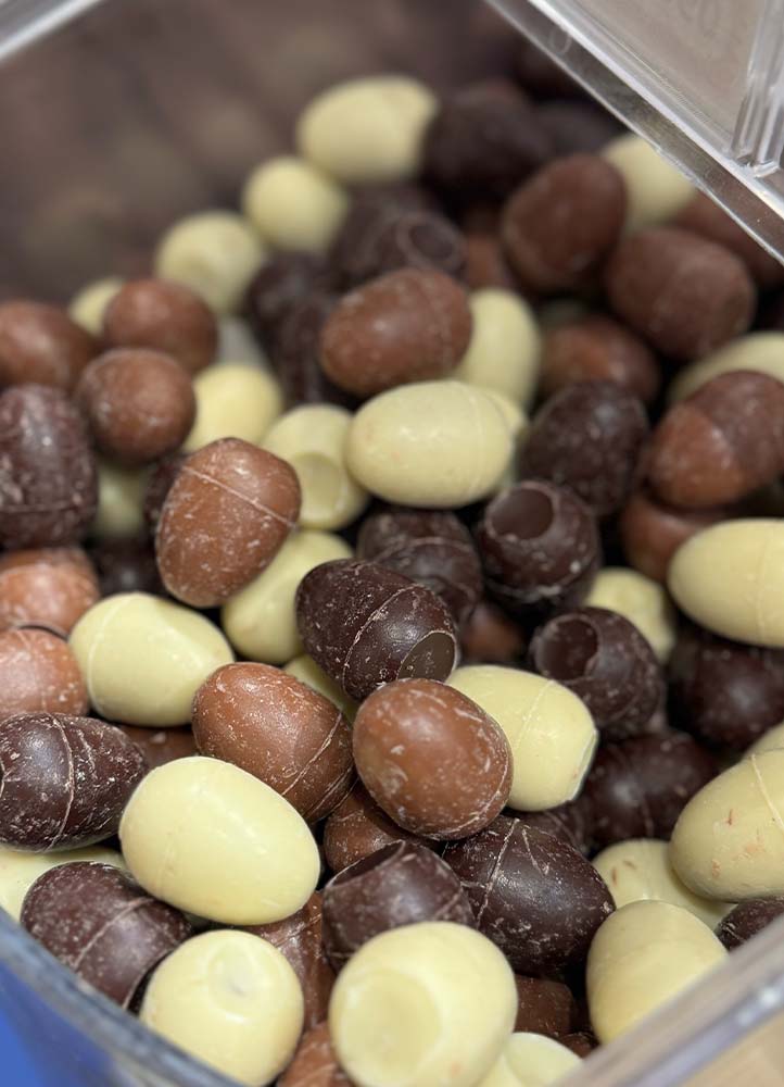 - des œufs au chocolat noir, lait et blanc fourrés au praliné
