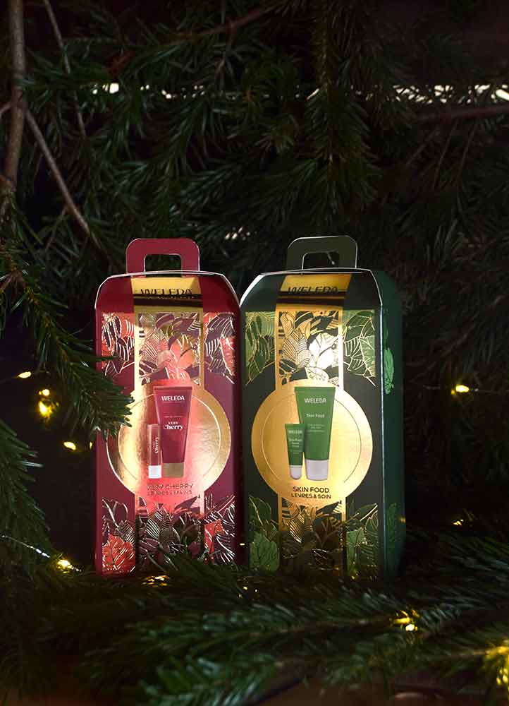 Et chez Weleda, deux jolies boîtes contenant une crème pour les mains et un baume à lèvres : gourmand à la cerise ou réparateur au romarin.