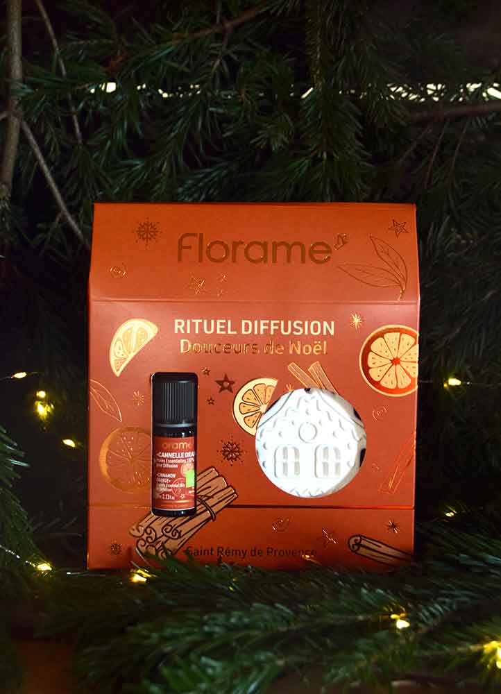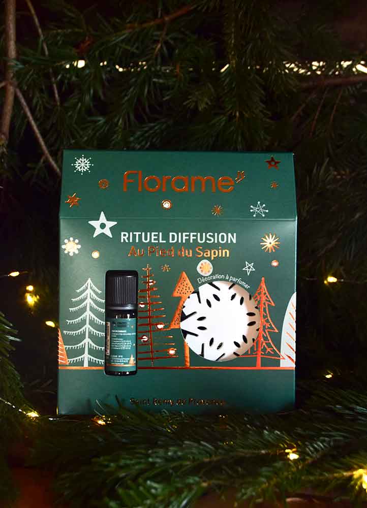 Les coffrets Florame associent une composition d’huiles essentielles bio et une suspension à parfumer en forme de flocon de neige ou de maison :