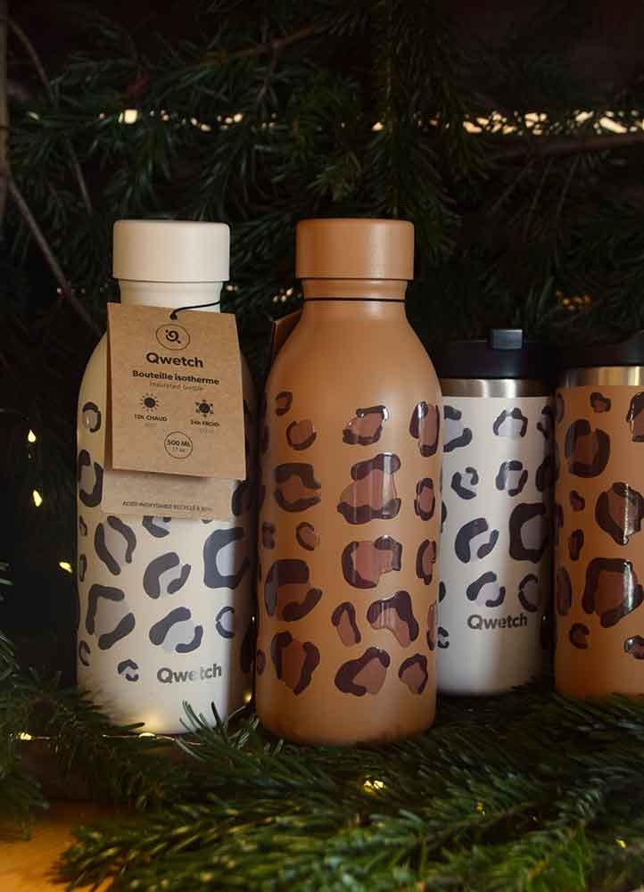 Pratiques et tendance, les gourdes à imprimé léopard de Qwetch sont arrivées en magasin : la bouteille isotherme et le mug marron ou blancs.
