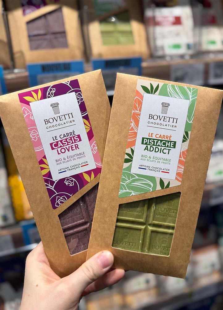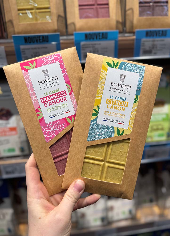 Alors que le printemps pointe le bout de son nez, la chocolaterie Bovetti a concocté quatre nouvelles tablettes de chocolat qui allient douceur et éclats de fruits colorés (grâce à des poudres végétales issues de fruits et de légumes) :