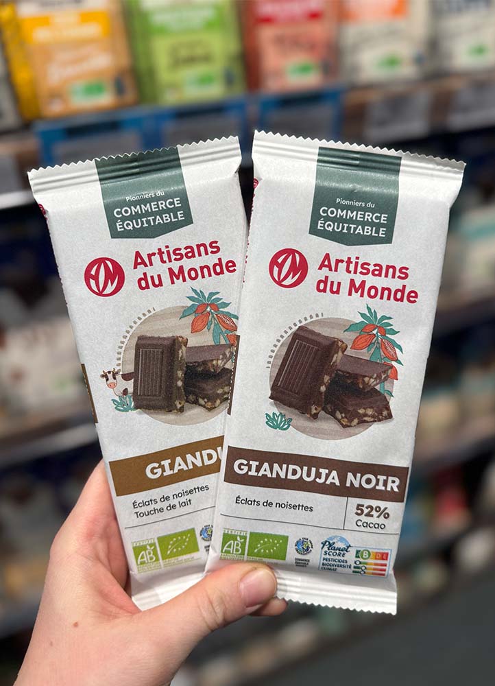 Chez Artisan du Monde, deux tablettes au gianduja mêlant noisettes finement broyées et éclats croustillants.