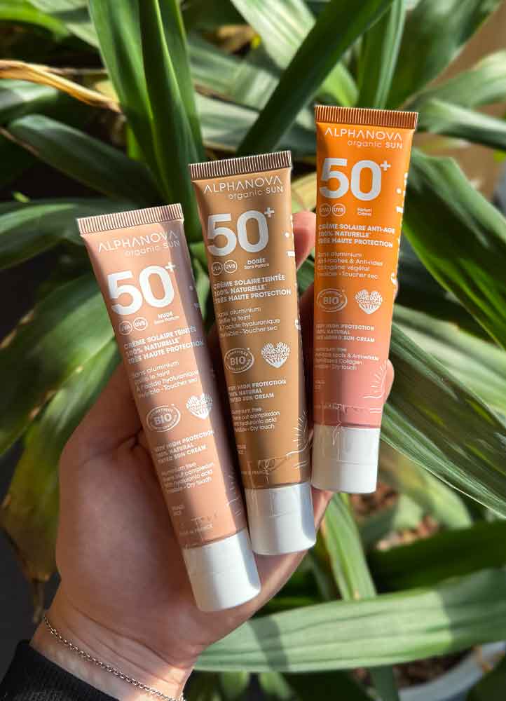 En plus des traditionnels soins solaires que vous connaissez déjà, Alphanova a développé trois crèmes solaires très haute protection SPF50+, double protection UVA et UVB, qui nourrissent la peau :