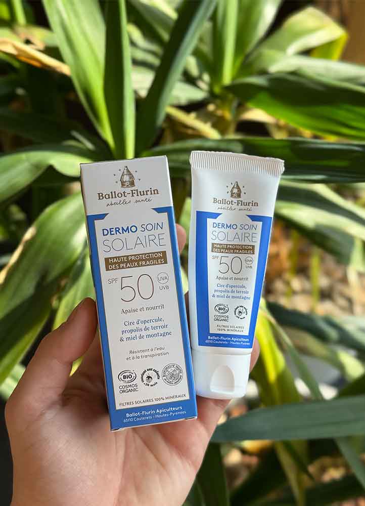 • Le dermo soin solaire SPF50 de Ballot Flurin qui apaise, nourrit et unifie le teint à la texture fondante, non collante et non grasse, qui convient aux enfants de plus de 36 mois et aux femmes enceintes et allaitantes