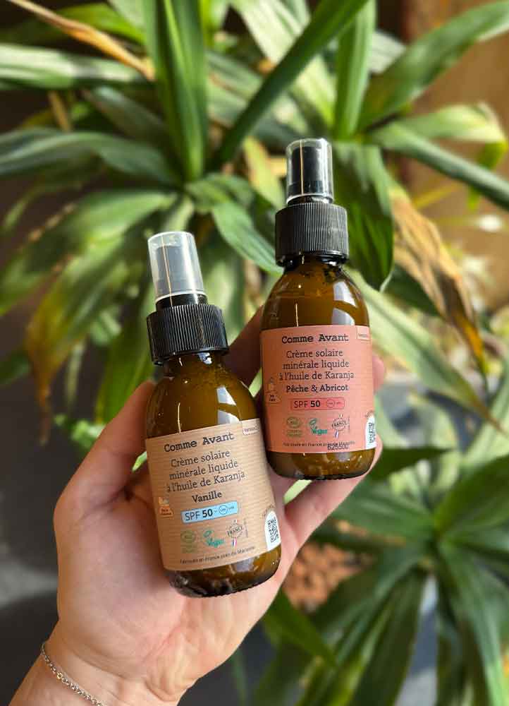 Après les crèmes solaires solides que vous avez découvertes l’été dernier, nous venons de recevoir deux crèmes solaires liquides Comme Avant à l’oxyde de zinc, adaptées aux enfants dès la naissance et aux femmes enceintes :