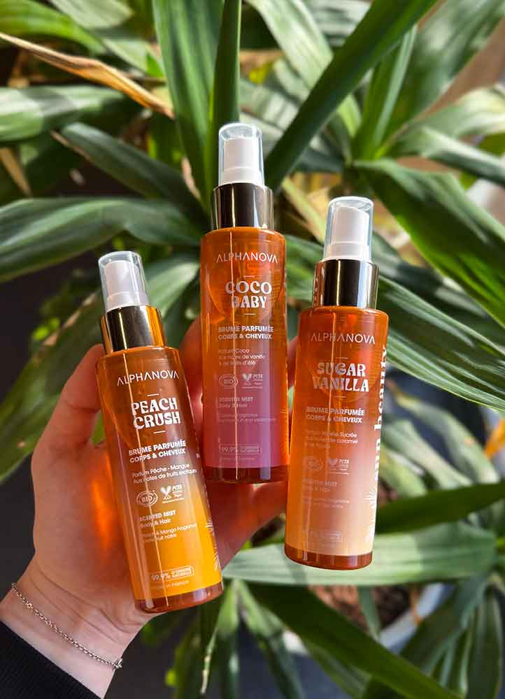 Toujours chez Alphanova, nous avons craqué pour trois brumes corps et cheveux enrichies en eau de coco, au parfum non photosensibilisant :