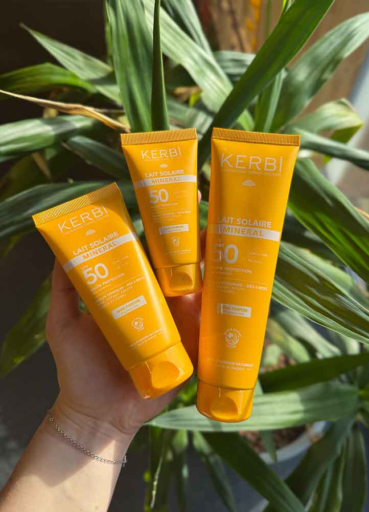 • Le lait solaire minéral SPF50 sans parfum disponible en trois formats