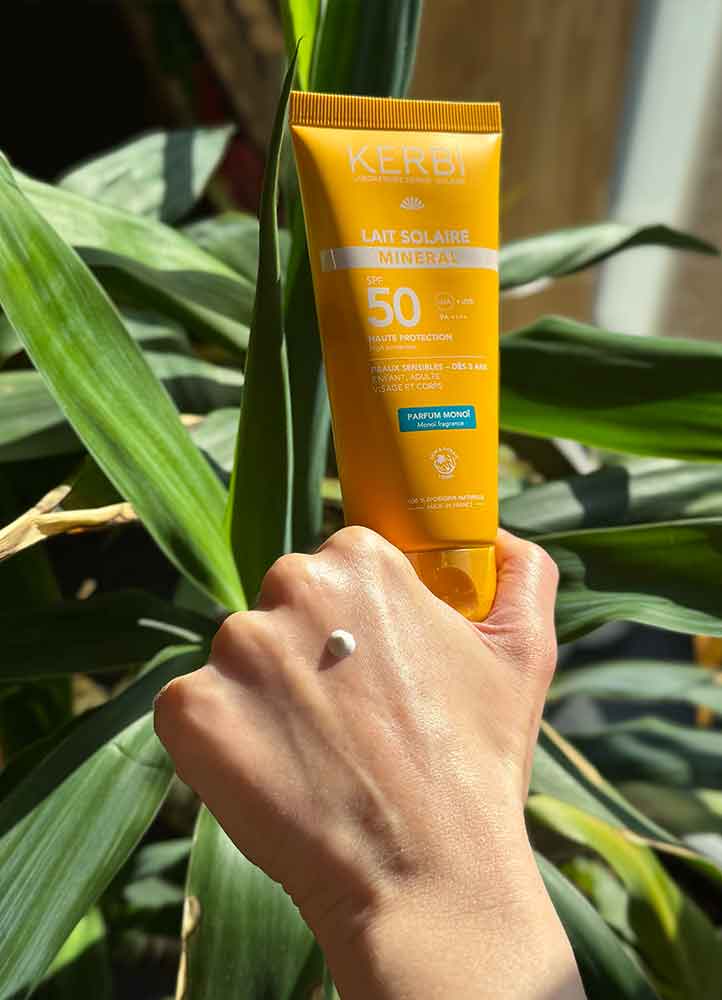 • Le lait solaire minéral SPF50 au doux parfum de monoï