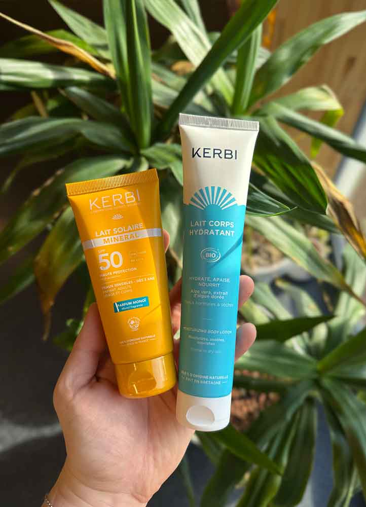 • La crème de jour hydratante SPF50 de Kerbi au parfum marin réconfortant, riche en aloe vera et en algue dorée bretonne qui apaise et renforce la barrière cutanée