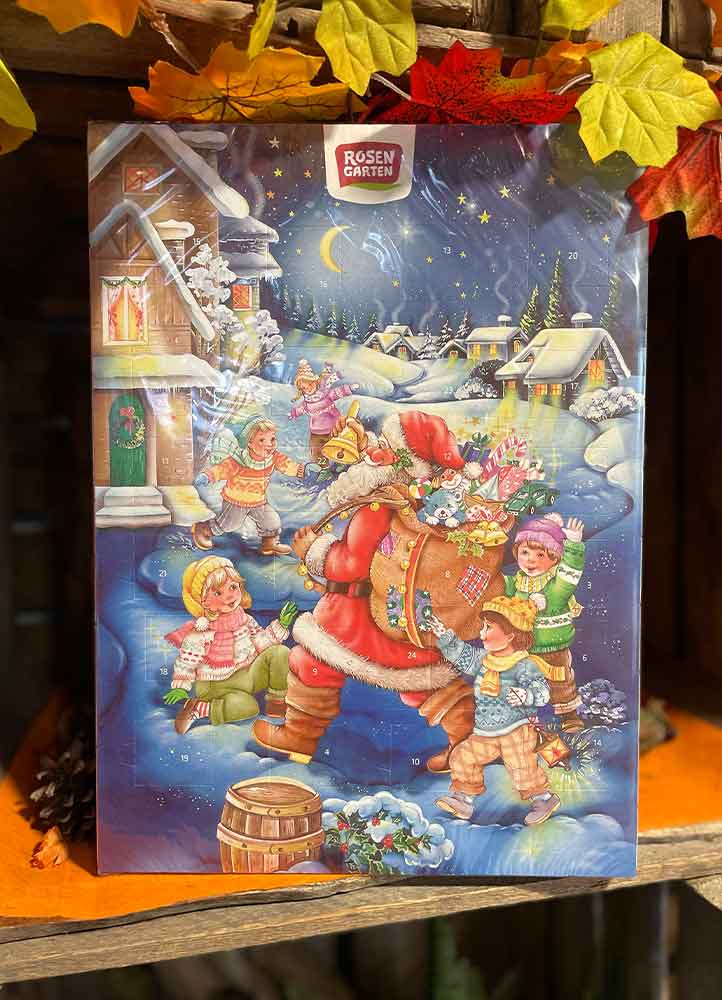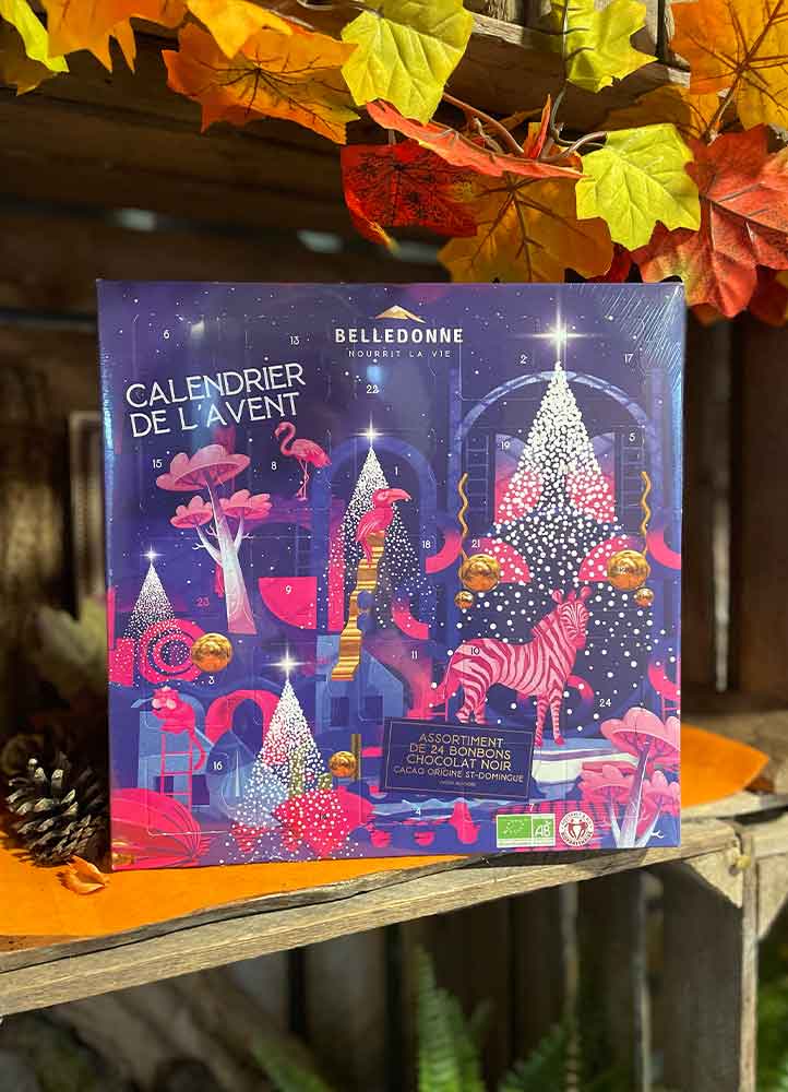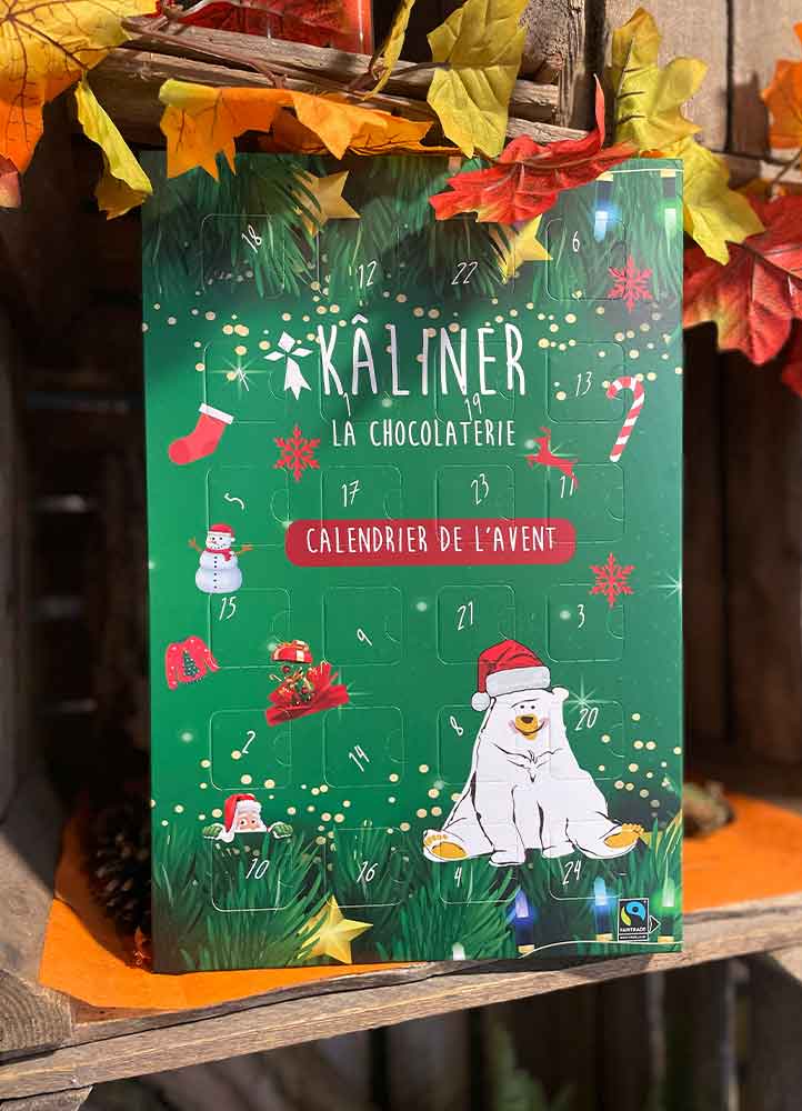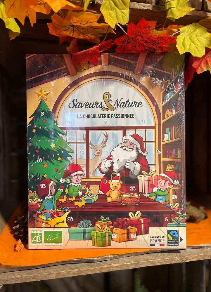 La chocolaterie Saveurs et Nature propose chaque année de délicieux et originaux calendriers de l’Avent. Celui-ci est composé de différents chocolats bio : billes de céréales aux trois chocolats, carrés de chocolat lait fourrés lactés, figurines de chocolat au lait et chocolat noir… et le 24, un moulage de père Noël !